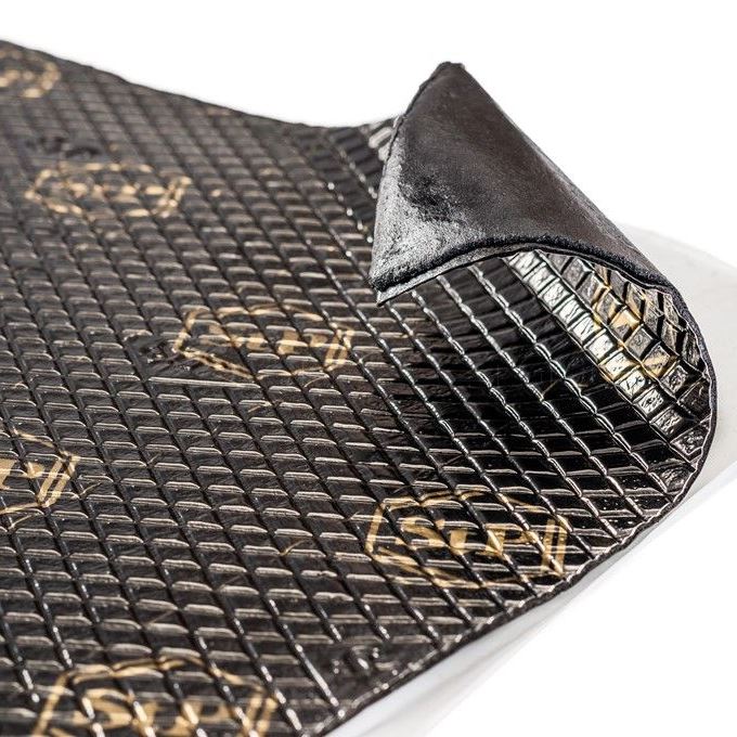 Самоклеящийся вибропоглощающий материал. Представляет собой трехслойную конструкцию, состоящую из лицевого слоя алюминиевой фольги, битумного слоя и липкого монтажного слоя на основе вибродемпфирующей мастики, защищенной антиадгезионной бумагой. Для монтажа требует дополнительного нагрева. Материал не впитывает влагу и не разлагается, обладает свойством герметика. Рекомендуется для применения в самых вибронагруженных зонах.